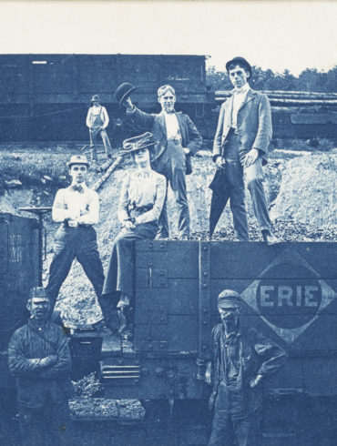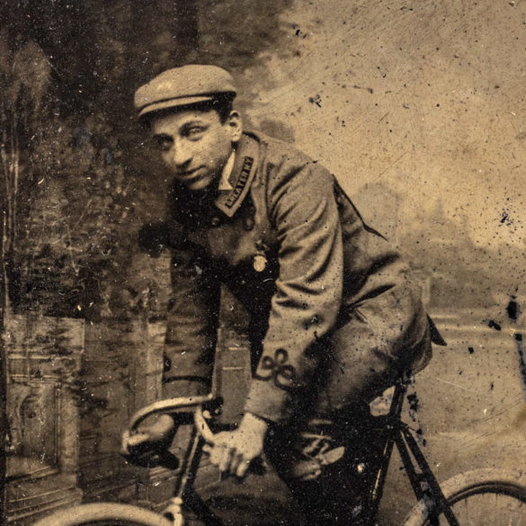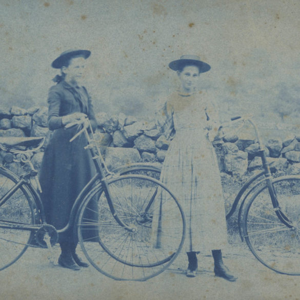 Deux jeunes filles sont photographiées sur le point d’enfourcher leur bicyclette. On retrouve la recherche d’un équilibre entre sophistication et représentation du naturel de la vie quotidienne.