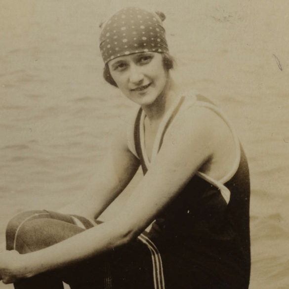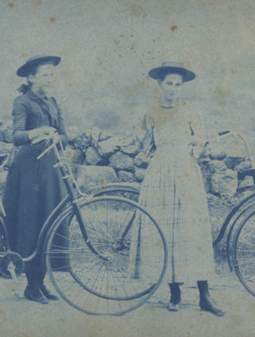 Deux jeunes filles sont photographiées sur le point d’enfourcher leur bicyclette. On retrouve la recherche d’un équilibre entre sophistication et représentation du naturel de la vie quotidienne.