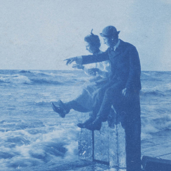 Deux jeunes filles sont photographiées sur le point d’enfourcher leur bicyclette. On retrouve la recherche d’un équilibre entre sophistication et représentation du naturel de la vie quotidienne.